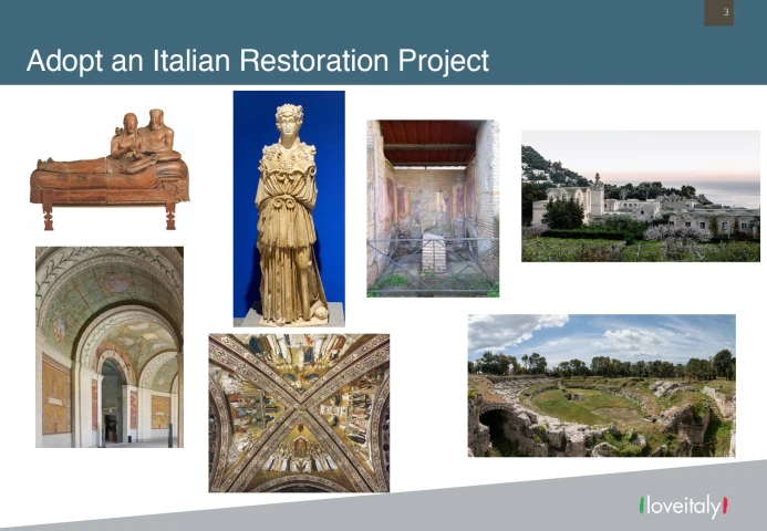 LoveItaly is a non-profit organization dedicated to the preservation of Italy’s unique cultural heritage and the world’s greatest living museum, the country of Italy! The association is the first of its kind to support conservation projects throughout the Italian Peninsula.