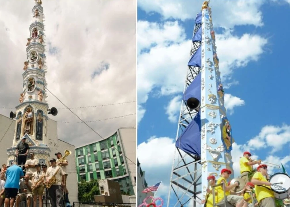 The Giglio Feast is centered around a the Giglio, a seven-story-tall, four-ton tower, made of aluminum and adorned with papier-mache flowers, angels, and religious figures. Throughout the feast, over 100 men will lift and walk the tower through the streets of Williamsburg, all while a brass band performs at the base of the tower.