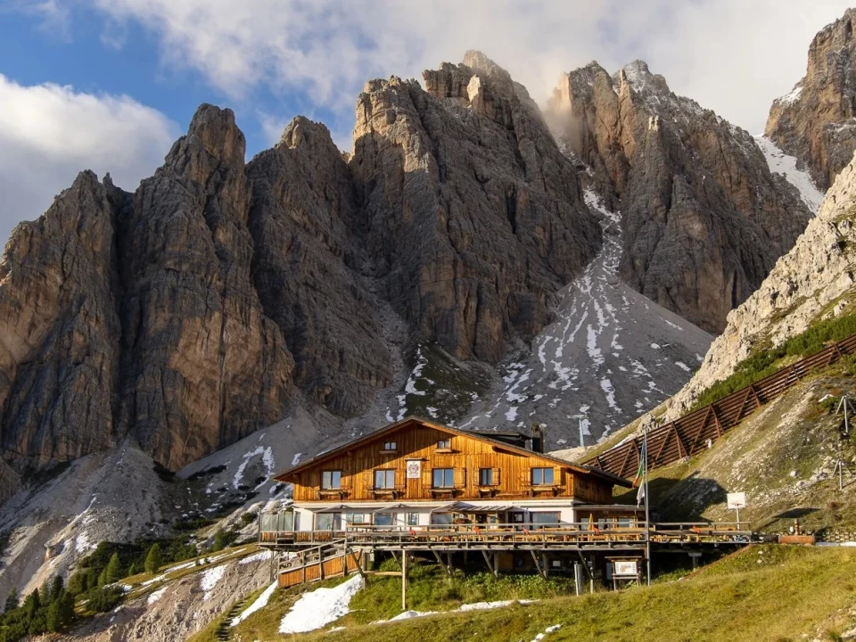 I’m standing alone on a ledge high in the Italian Dolomites, a few metres from a vertiginous drop to a valley floor far below. With the sun slowly dipping below the jagged horizon, the frigid alpine air is turning my fingers numb and I can no longer feel the buttons of my camera. “Dinner’s ready,” comes a shout to call me back inside the nearby mountain hut, Rifugio Son Forca (pictured above), perched at an elevation of 2235 metres on the side of Monte Cristallo.