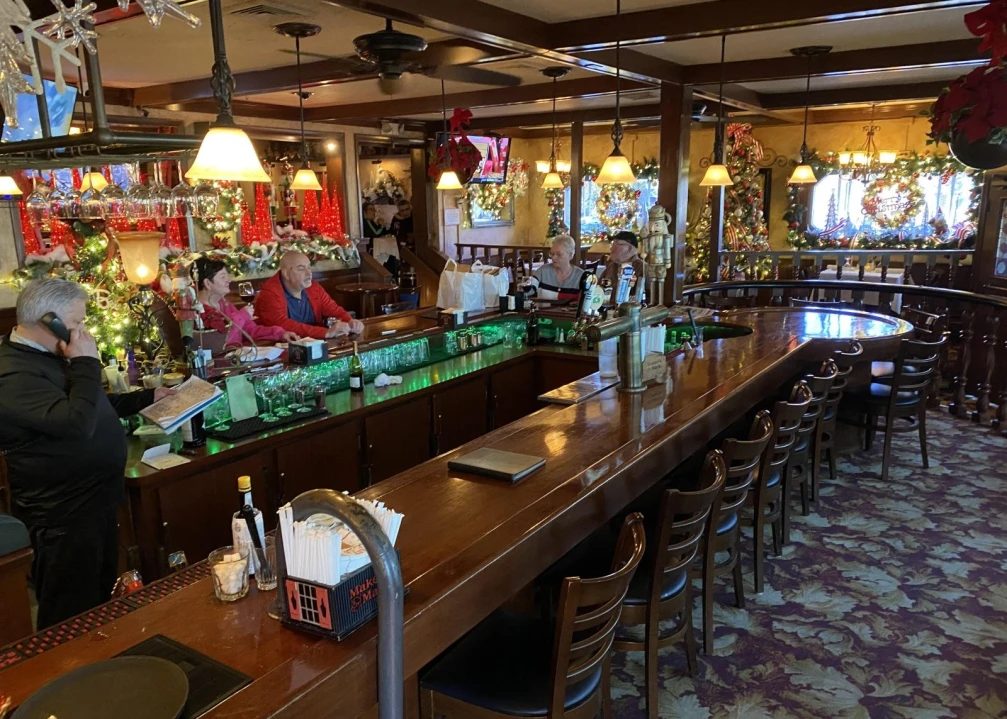 After two lunchtime visits, friends and I concluded the ambiance falls somewhere in the middle of supper club, fine dining, and German Rathskeller. Our table was lovely, set with glass water goblets, a white tablecloth, and a charming Christmas decoration that added seasonal joy. As soon as we were seated our server brought a basket of bread with a pitcher of olive oil and a container filled with soft butter, an improvement over the little butter briquets often presented with a bread basket.