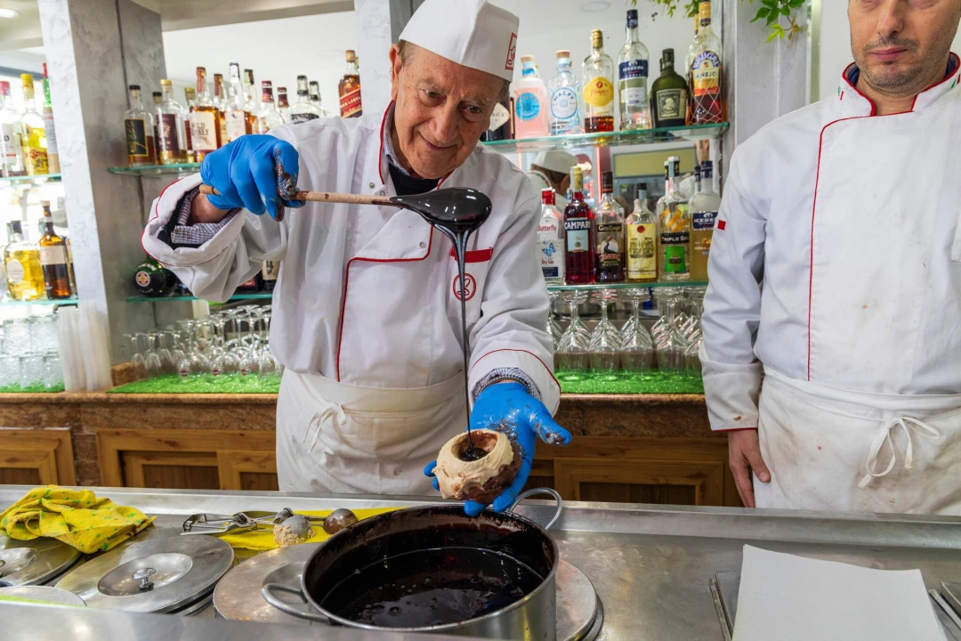 On a rocky cliff above the Tyrrhenian Sea, in Calabria’s province of Vibo Valentia, we find the town of Pizzo. Small in population but rich in reputation, it is known across Italy as “the town of gelato.” Its fame, however, doesn’t come from the amount of gelato produced, but from a single, iconic creation: the Tartufo di Pizzo, a dense, round ball of hazelnut and chocolate gelato, filled with a molten chocolate heart dusted with cocoa powder.