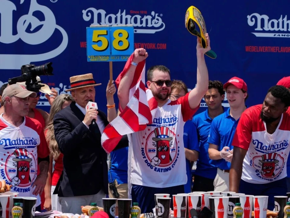 Patrick Bertoletti gobbled up 58 hot dogs to win his first men’s title Thursday at the annual Nathan’s Famous Fourth of July hot dog eating contest, taking advantage of the absence of the event's biggest star. In the women's competition, defending champion Miki Sudo won her 10th title and set a new world record by downing 51 links.