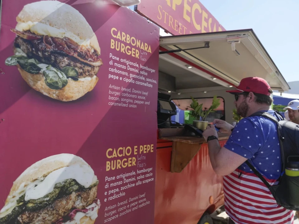 Beyond the fancy hospitality tents, the Ryder Cup’s food scene is decidedly local at the Marco Simone club outside Rome. There’s an “APECESARE” food truck named after Julius Caesar selling “Street Food Romano,” where the menu highlight is a carbonara burger — a spinoff on Rome’s most famous pasta dish — with Damini beef, carbonara sauce, guanciale, soncino lettuce, pepper and caramelized onion.