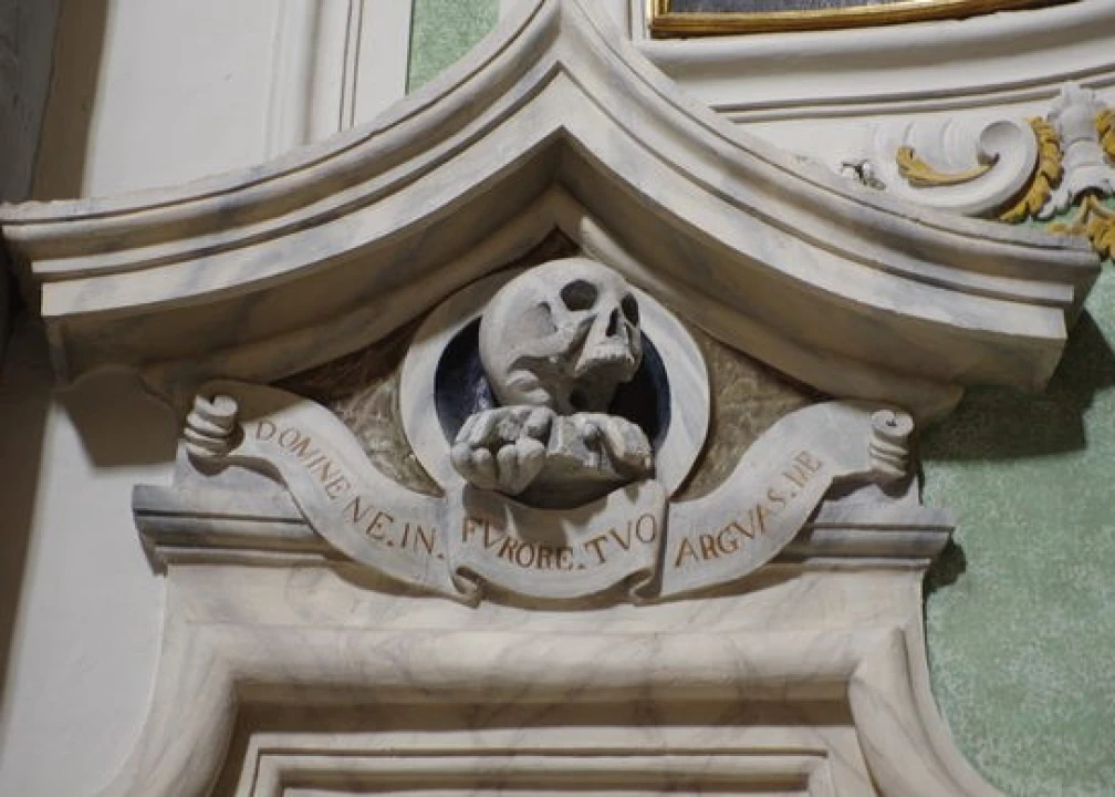 The upper part of the facade shows angels, fruit baskets, and penitents wrapped in flames. On the lower part, the wooden door is divided into 36 squares. It’s decorated with four skulls of nobles and clergymen and just under these, four skulls representing common people, with four more on the side of the entrance.