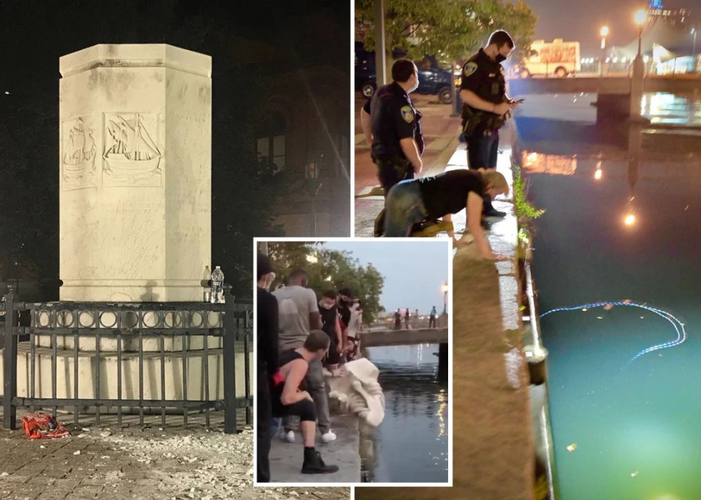 A crowd of shouting protesters yanked down the Christopher Columbus statue near Little Italy, dragged it to the edge of Baltimore’s Inner Harbor and rolled it with a splash into the water as fireworks went off around the city on the night of the Fourth of July.