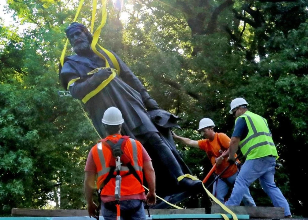 The statue on Main Drive near the east entrance to the park had survived years of vandalism and several protests calling for its removal by activists concerned with the Italian explorer’s mistreatment of indigenous people. Crews used a crane early Tuesday to carefully remove the statue and load it onto a truck, leaving only its stone base marked with fading graffiti.