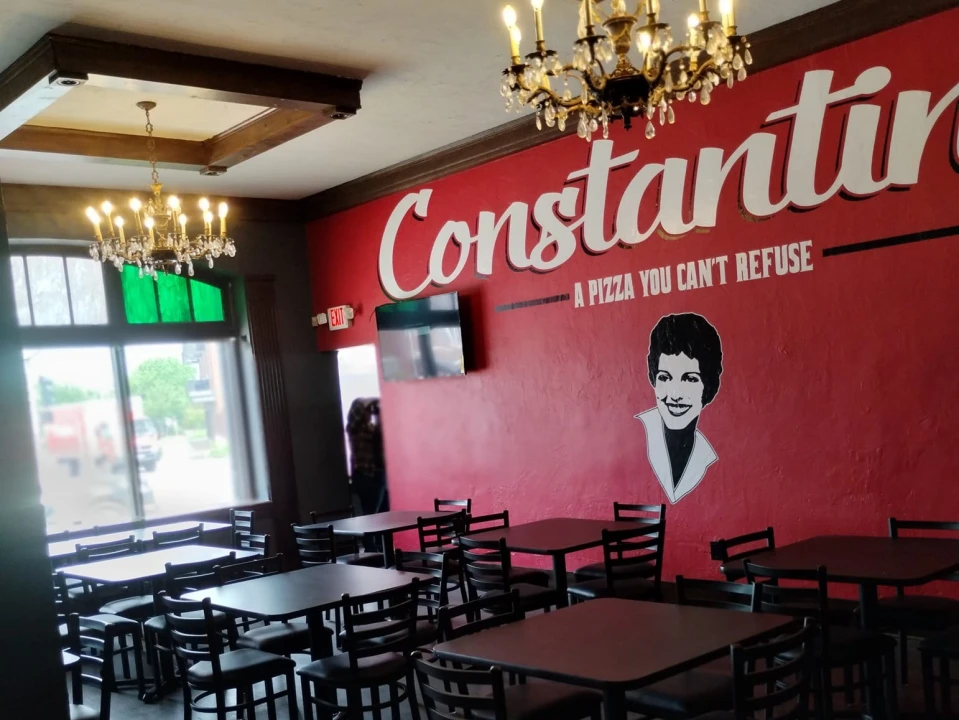 When we stopped by this morning, preparations – which have been underway for a year and a half – were close to completion. There’s a brand new kitchen, which includes a monster 6,000-pound pizza oven; the tables and chairs were in place, and one of the walls had been freshly painted with Constantino’s logo.