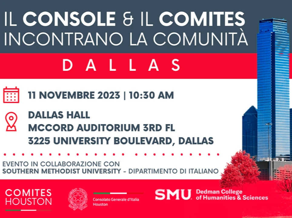 Comites Houston is pleased to invite you to a special event with the Consul General of Italy in Houston, Mauro Lorenzini. The appointment is scheduled for November 11th at Southern Methodist University in Dallas at 10:30 a.m. The event will open with a presentation by Comites, which will illustrate its important contribution in supporting compatriots, the activities carried out and those currently underway.