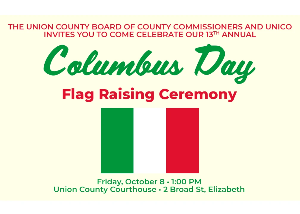 The Board of County Commissioners invites residents to Union County’s 13th Annual Columbus Day Flag Raising event. The ceremony will take place Friday, Oct. 8th, at 1:00 p.m., on the steps of the historic Union County Courthouse, located at 2 Broad Street in Elizabeth.