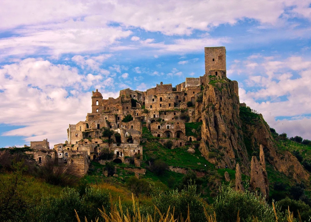 A ghost town more alive than ever. Here is Craco, a small village in the province of Matera, in Basilicata, perched on a hill and surrounded by vast fields of wheat and the characteristic “calanchi”, deep furrows in the ground along the side of a mountain or a hill.