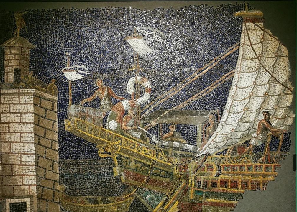 Standing in front of a huge, darkly glittering wall mosaic from the first years of the third century CE, I find myself drawn into a lost world. A ship is departing a port in Alexandria, Egypt, its sails billowing, sailors working the ropes, and to the left is a tall lighthouse.