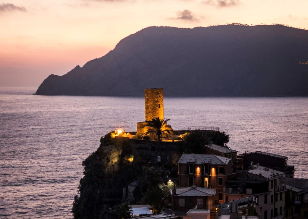 CINQUE TERRE IS A FAMOUS area of the Italian Riviera along the coast of Liguria. The rugged and mountainous terrain that makes up this coast creates many promontories and inlets. A medieval fortress known as Doria Castle (Castello Doria) stands on top of a rocky ridge near the village of Vernazza.