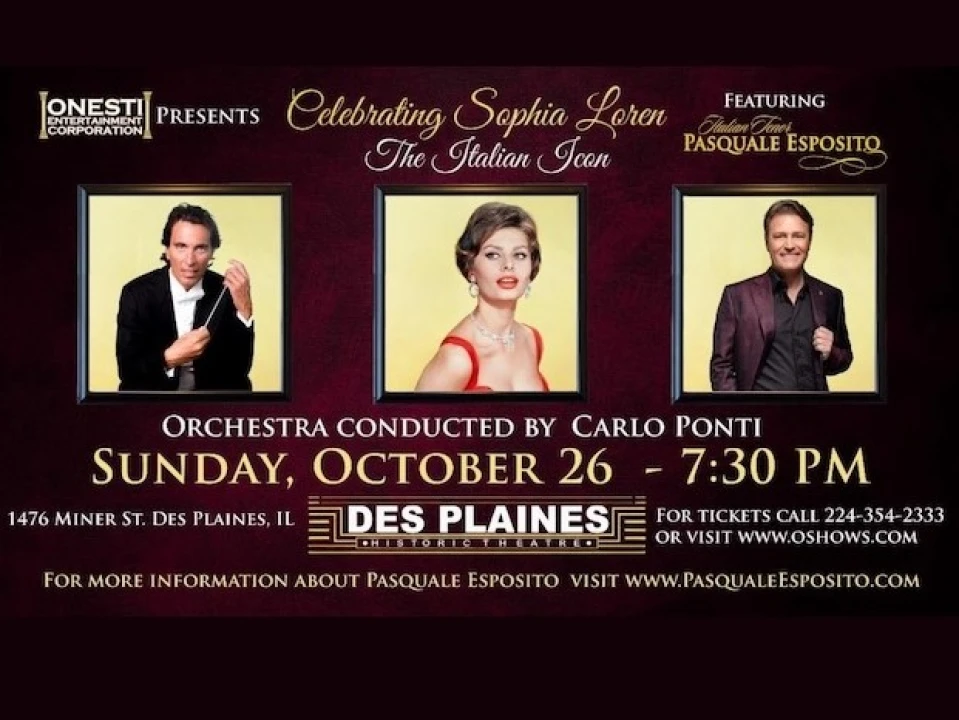 The Des Plaines Theatre will celebrate the artistry and legacy of Sophia Loren at 7:30 p.m. on Oct. 26 with a concert featuring renowned tenor Pasquale Esposito and acclaimed conductor Carlo Ponti and the Los Angeles Virtuosi Orchestra.
