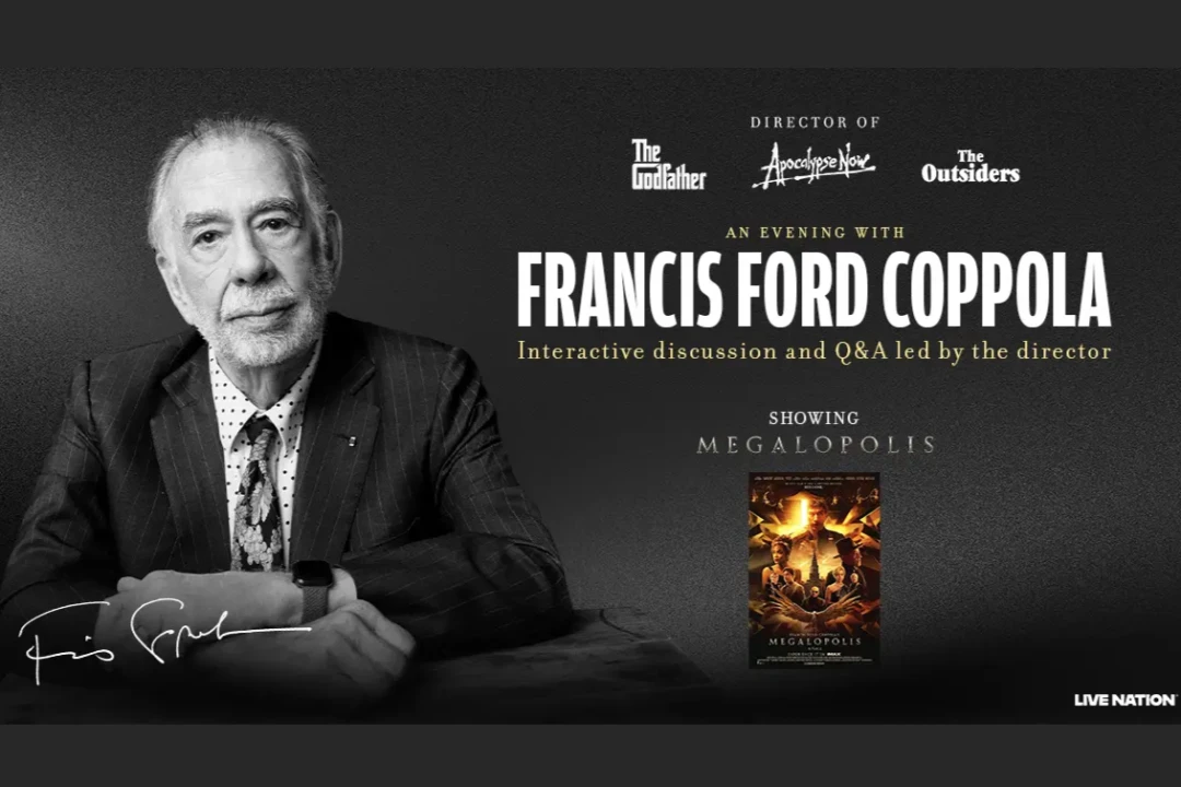 Legendary director, Francis Ford Coppola (The Godfather, Apocalypse Now, The Outsiders) is bringing his monumental 2024 film, MEGALOPOLIS, to select cities across the country. This exclusive event offers a rare chance to experience the film as it was meant to be seen—on the big screen, surrounded by a live audience. Following the screening, Coppola will lead an interactive conversation about the future of humanity, along with a live audience Q&A.