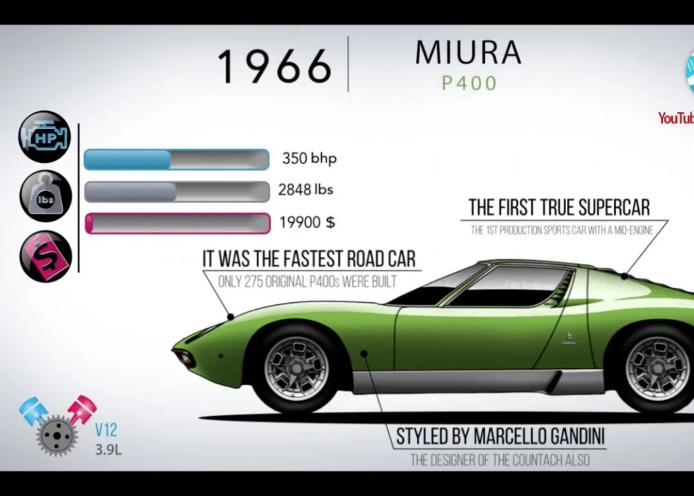 It was followed by the 400 GT, an evolution of the original. The Miura came in 1966 and it established the rear mid-engine, rear wheel drive as the standard layout for high-performance cars of the era.