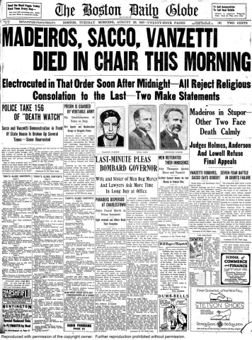 It is also important to note that Judge Webster Thayer presided over Vanzetti’s first trial. Thayer was then the judge who presided over the second trial of Vanzetti and Sacco for the Braintree robbery-murder. The second trial ended with their conviction in 1921. For the next several years a great effort was made on the part of their lawyers, especially Fred Moore, to get them a new trial. Moore filed five supplementary motions for a new trial, all of which were denied by JudgeThayer. Think about it: the same judge who presided over the conviction of Vanzetti in his first trial, and presided over the conviction of Sacco and Vanzetti in the second trial, decided on the appeals for a new trial. In order to have sided with the defendants, Judge Thayer would have had to have admitted, “I did something wrong during the Braintree trial,” and he just wasn't going to do that. He rejected all of the motions for a new trial, even though they were pretty serious motions. For example, one motion alleged perjury by witnesses for the prosecution. There was also a claim that police and federal authorities were colluding with each other. And there was a confession for the Braintree crime by a convicted bank robber named Celestino Madeiros, as well as evidence that the Braintree robbery-murder had actually been committed by a gang from Rhode Island, the Morelli Brothers. All these challenges were futile, however, and Sacco and Vanzetti were sentenced to death in 1926. They were electrocuted at just after midnight on August 23th, 1927.