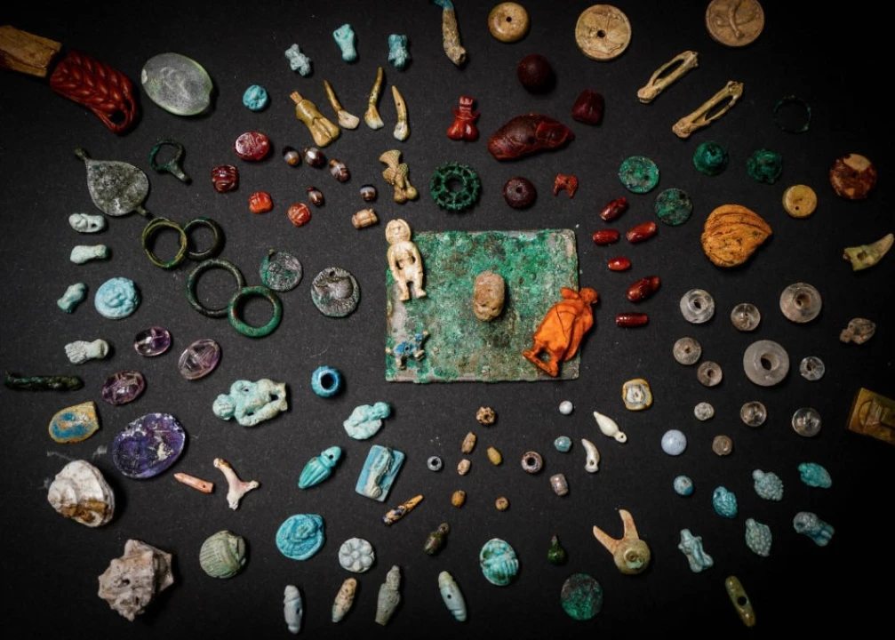 The experts found more than 100 miniature objects in a wooden crate that had all but decomposed except for its bronze hinges. Inside the box was a hoard that includes miniature dolls, phallic amulets, necklace beads, and a tiny skull among other objects made of bone, bronze, glass, and amber.