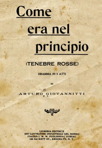 On October 10, 1918 Arturo Giovannitti's play Come era nel principio (Tenebre rosse)—"At the Beginning (Red Shadows)"—premiered in New York's "People's Theatre," starring Mimi Aguglia, who later became a Hollywood actress. Aguglia appeared in The Rose Tattoo, with Anna Magnani and Burt Lancaster, a movie depicting an Italian community in Louisiana.
