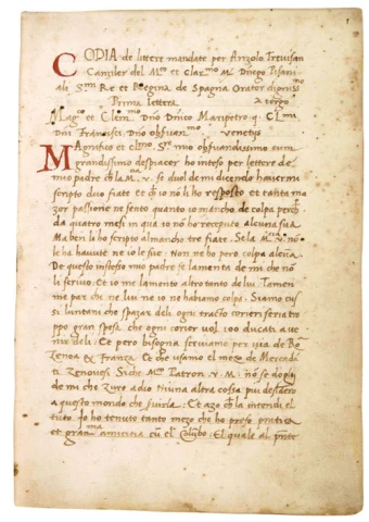 It also holds the manuscript by Angelo Trevisan, a secretary to the Venetian ambassador to Spain, who wrote another account of Columbus's first voyages. Trevisan knew Columbus personally, whom he described as "a tall man of distinguished bearing . . . with great intelligence and a long face."