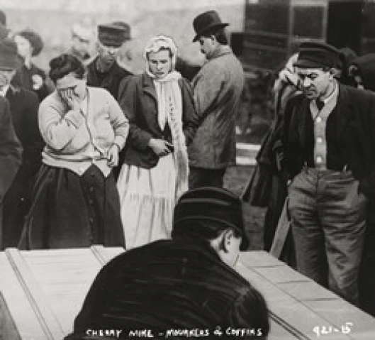 In some areas, mining jobs were among the most popular for Italians. In 1910 between 10 and 20 percent of the workers in the coal mines of West Virginia, the Southwest and Midwest were Italian. Except in Pennsylvania, where the Slavs were in the majority, Italians were the largest group of immigrants employed in coal mines. History is punctuated by terrible accidents that killed hundreds of miners. In Cherry, Illinois on November 13, 1909, 259 miners died; at least seventy-three were Italians. The photograph shows the desperation of the relatives of the dead, crying by the simple wooden coffins holding the recovered bodies.