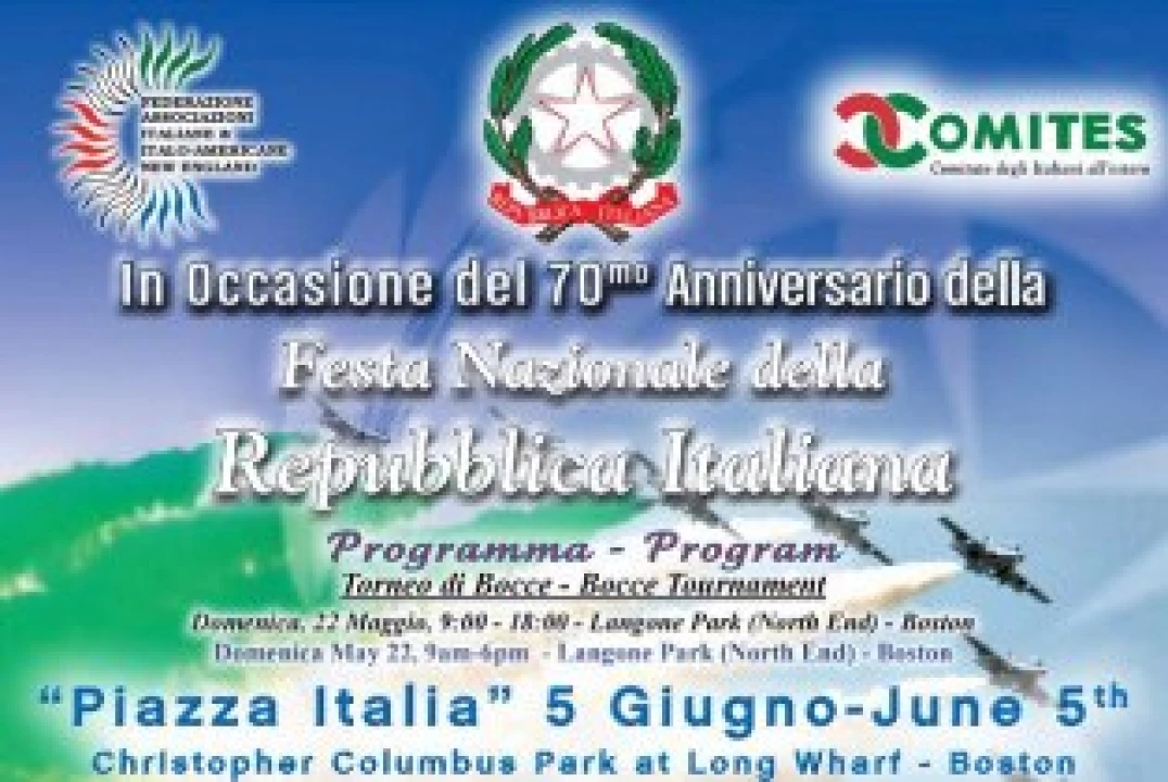 The annual Festa Nazionale della Repubblica Italiana and "Piazza Italia" is scheduled for Sunday June 5, 2016, at Christopher Columbus Park on Atlantic Avenue in the North End of Boston. The event starts at 10 a.m. and runs through the afternoon with free exhibits, children's area and Italian music.