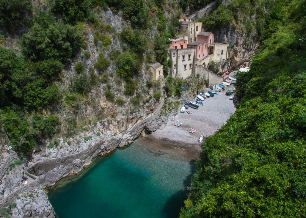 THE RUGGED AND MOUNTAINOUS AMALFI Coast offers a countless scenic views and wonderful beaches, but among the most unique features in the area is the narrow opening known as Fiordo di Furore. Fiordo di Furore, which is actually a ria, not a fjord, is an inlet created by the Schiato torrent that flows between the rocks, creating a valley that opens to the sea. It is located near the small town of Furore, with the name coming from Latin Terra Furoris (Land of Fury), because of the deafening sound of the waves crashing on the cliffs.