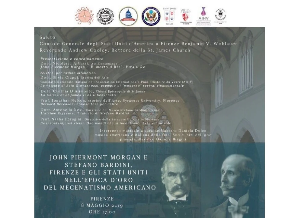 Wednesday May 8, from 17:00 to 19:00. Conferenza: "John Piermont Morgan e Stefano Bardini, Firenze e gli Stati Uniti nell'epoca d'oro del mecenatismo americano". L'evento si terrà presso la Chiesa episcopale americana di Saint James, Via B. Rucellai, 9 - Firenze. Al termine dell'evento si terrà un concerto a cura del Maestro Daniela Dolce, dedicato alla musica americana e italiana della fine '800 e inizi del '900.