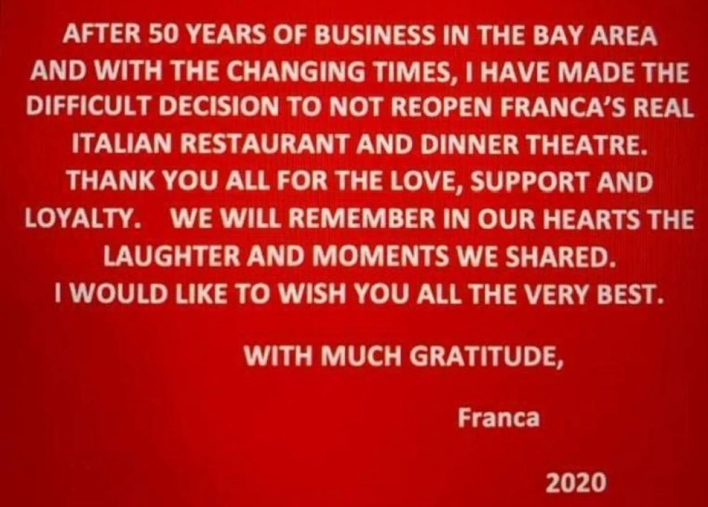 A statement reads on social media reads: “After 50 years of business in the Bay Area and with the changing times, I have made the difficult decision to not reopen Franca’s Real Italian Restaurant and Dinner Theatre. Thank you all for the love, support and loyalty. We will remembering our hearts the laughter and moments we shared. I would like to wish you all the very best. With much gratitude, Franca 2020.”