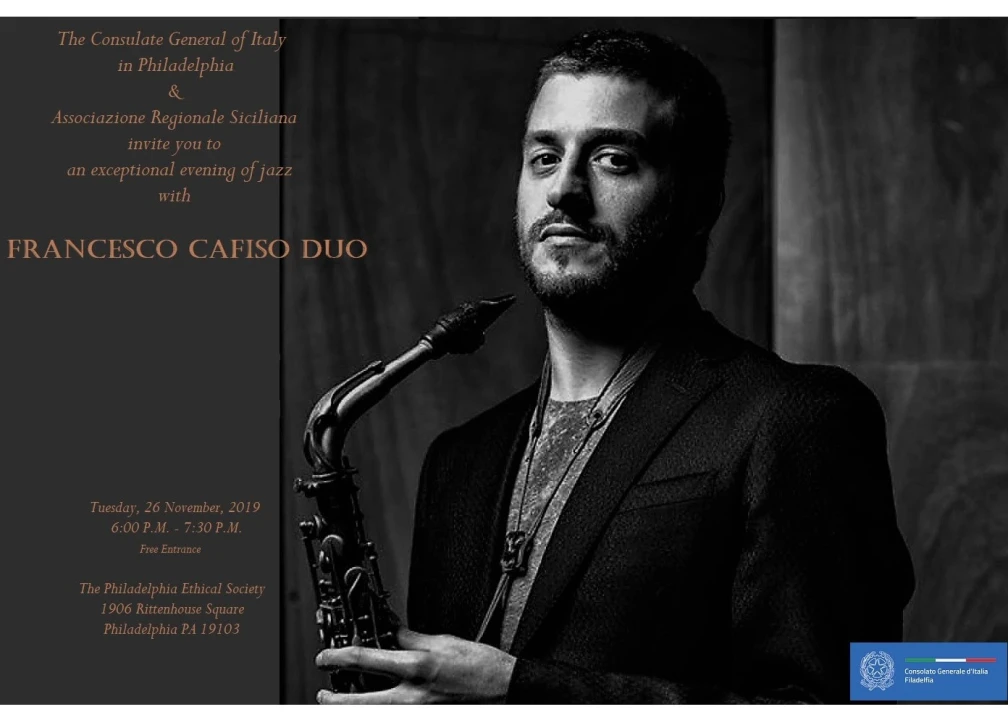 Tuesday, November 26, 2019. 6:00 P.M. - 7:30 P.M. The Philadelphia Ethical Society, 1906 Rittenhouse Square, Philadelphia PA 19103. Free entrance. Il repertorio include brani tipici della tradizione jazz, brasiliana e anche qualche brano italiano rivisitato in chiave jazz. Cafiso, con la sua voce calda e lirica, disarticola la melodia dei brani, costruendo assoli straordinari.