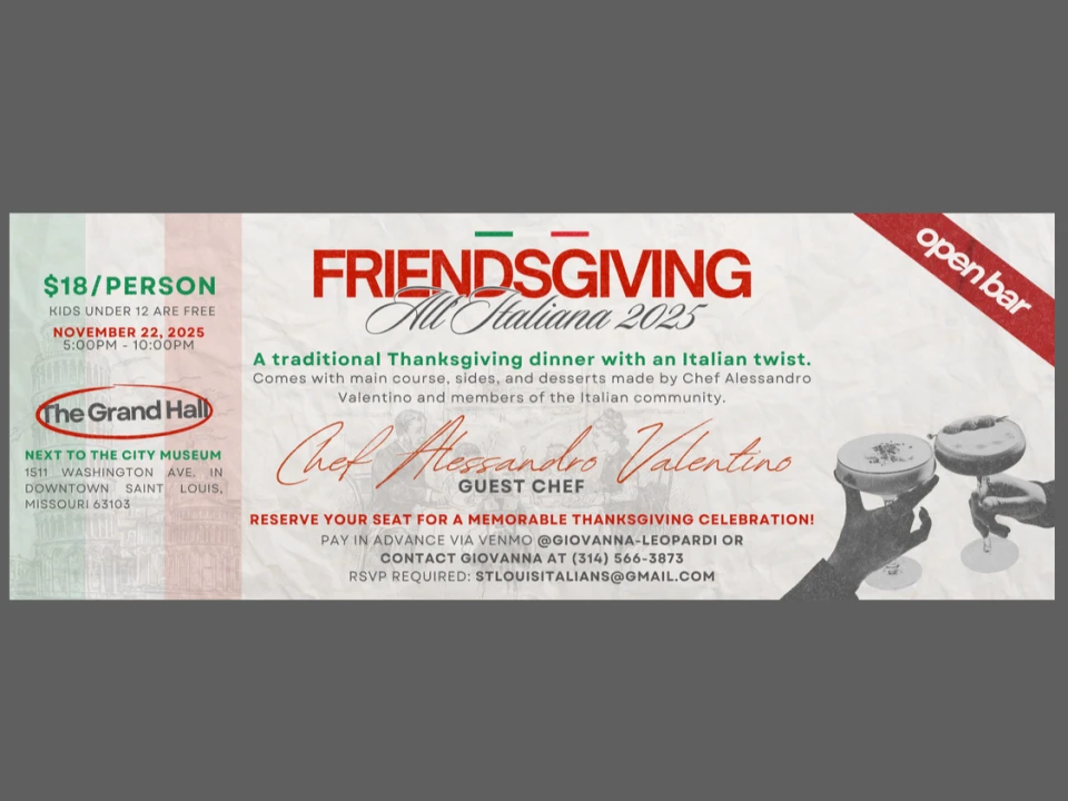 The Italian Community of St Louis invites you to our annual Friendsgiving, a traditional Thanksgiving celebration with an Italian twist, on Saturday, November 22, 5pm - 10pm. The purchase of a ticket includes main course, sides, and desserts made by Chef Alessandro Valentino and members of the Italian Community.