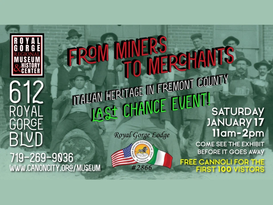 The event will be from 11 a.m. to 2 p.m. Jan. 17. This is a last-chance opportunity to experience the exhibit “From Miners to Merchants,” celebrating Italian heritage in Fremont County. The Order Sons and Daughters of Italy in America, Royal Gorge Lodge No. 2866, helped design and implement the exhibit and will be providing refreshments.