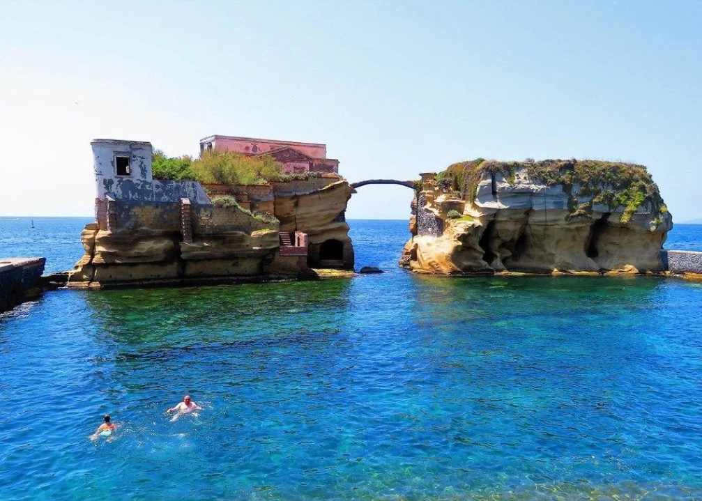 JUST SOUTH OF THE COAST of Posillipo, one of the most famous quarters of Naples, what looks like a pair of small islands turns out to be just one, with the two huge rocks connected by very a thin stone arch. Seen from the sea it’s a wonderfully odd sight, and yet this bizarre bridge is not the only unusual thing about Gaiola Island.