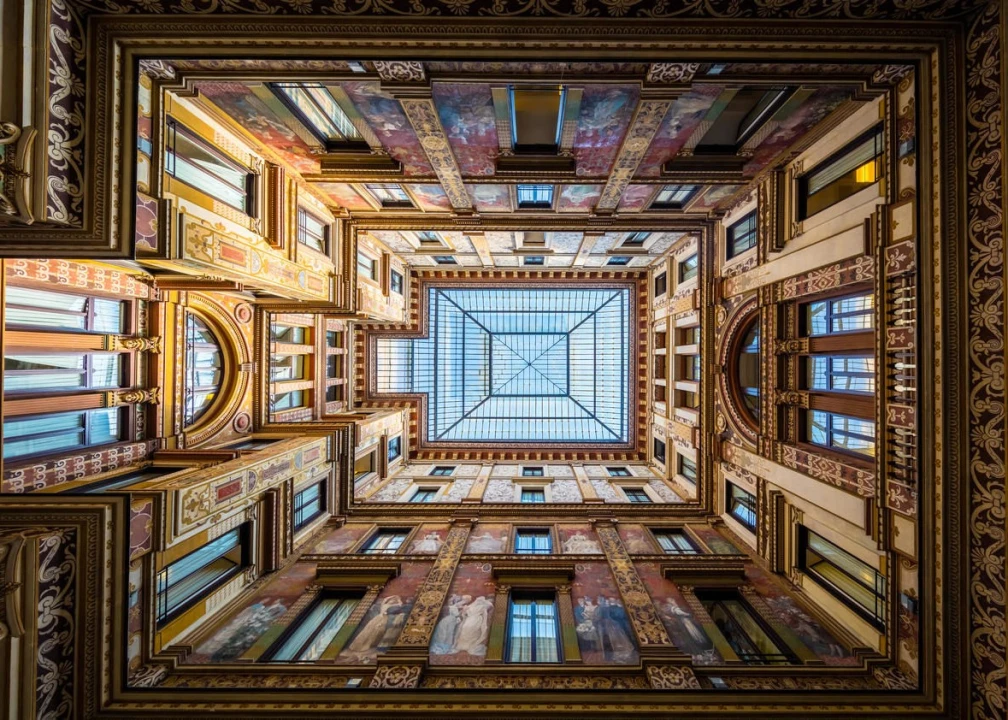 The women are the main focus, as the gorgeous artwork, which was painted by Giuseppe Cellini, is intended to celebrate women in the various phases of life. The glass and iron ceiling lets sunlight spill into the courtyard, illuminating the details in the frescoes. When the sun goes down, lights turn on to bathe the courtyard in a warm yellow glow.
