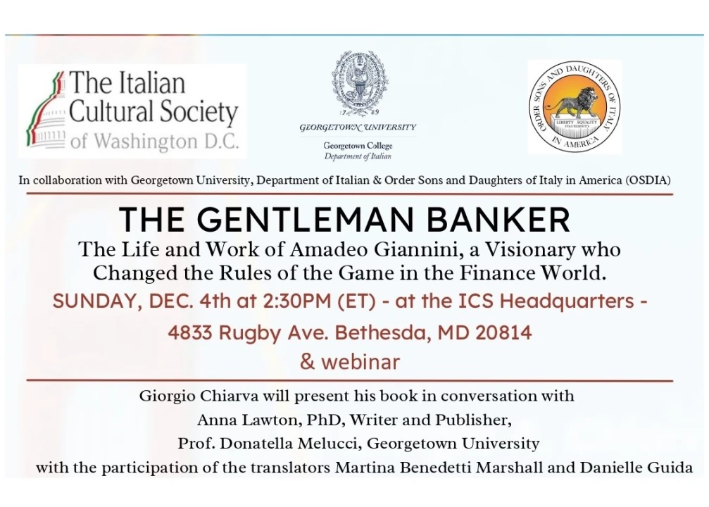 The Gentleman Banker. The Life and Work of Amadeo Giannini, a Visionary who Changed the Rules of the Game in the Finance World. Giorgio Chiarva will present his book in conversation with Anna Lawton, PhD, Writer and Publisher and Prof. Donatella Melucci, Georgetown University. With the participation of the translators Martina Benedetti Marshall and Danielle Guida.