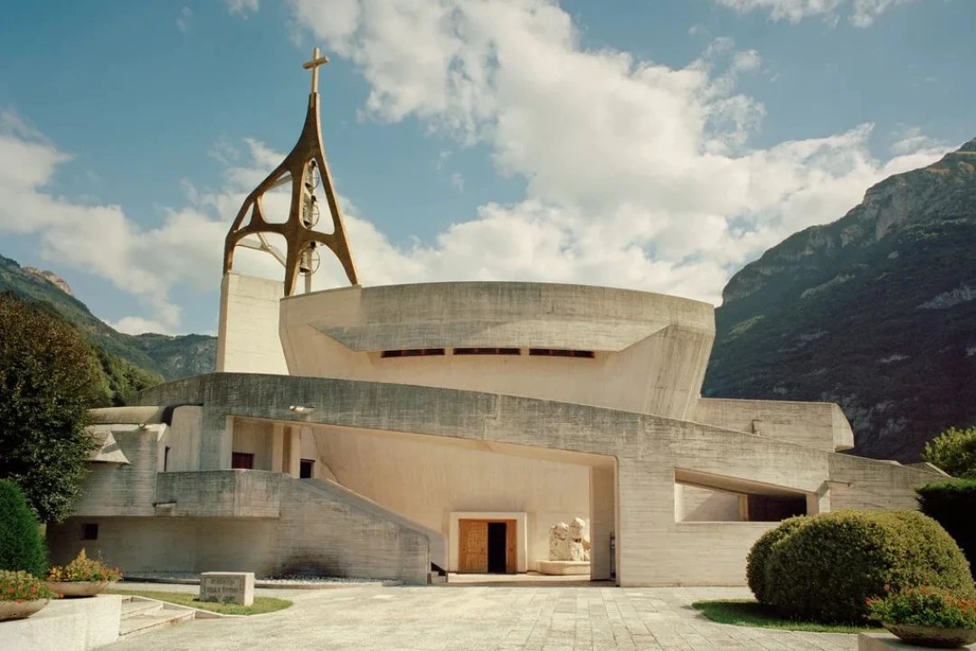 A two-minute walk from the station explains the out-of-place character of this mountain town. Here, in a small bus station square is one of the most extraordinary of all 20th-century European churches. Antithetical in terms of texture, composition and presence to every other building in Longarone, it’s as if a meteorite has crashed and, trying to raise itself from fractured ground, has morphed into some otherworldly formation.