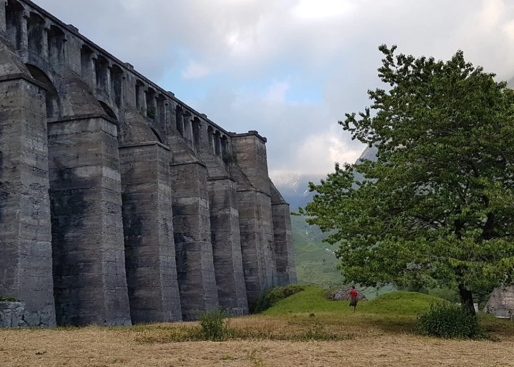 Construction of a hydroelectric dam to exploit the river Gleno in the the Valle di Scalve (Scalve valley) began in 1916, but the project was immediately cursed by poor materials and poor workmanship. On top of that, due to funding problems, the plan changed from the original idea of a gravity dam to a multiple-arch dam while the work was still in progress, resulting in a mixed-type dam.