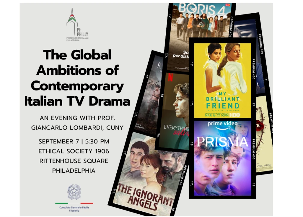 Pi-Philly and the Consulate of Italy in Philadelphia present "The Global Ambitions of Contemporary Italian TV Drama" on September 7th, 2023 at 5:30PM at the Ethical Society, 1906 Rittenhouse Square, Philadelphia, PA. Free entrance, but RSVP is REQUIRED, here!