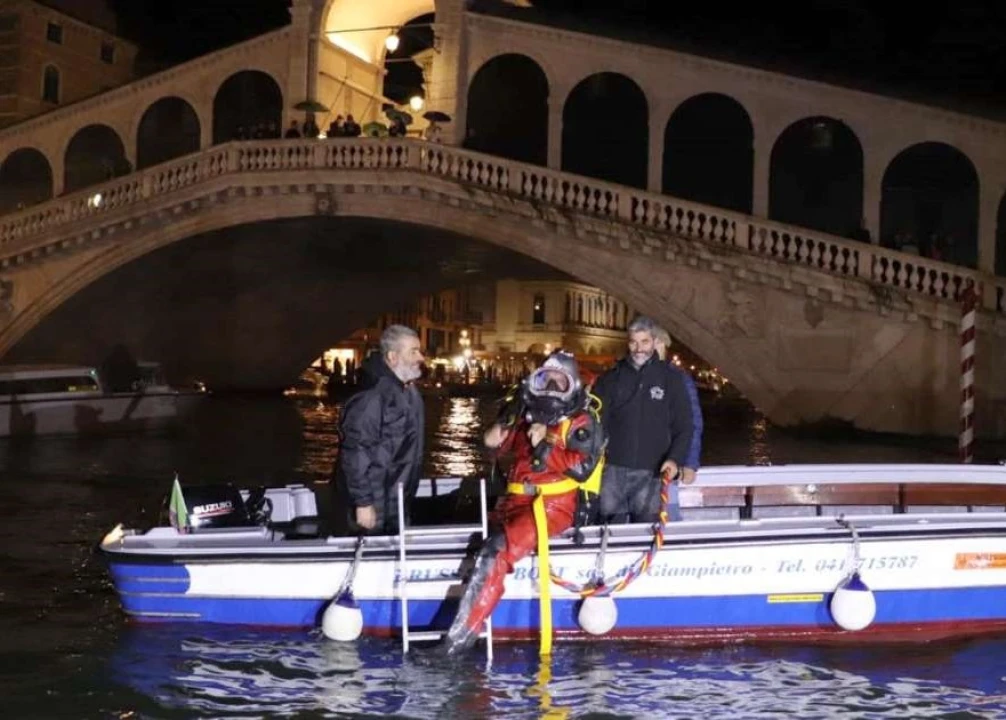 These Venetian gondoliers swapped their traditional striped T-shirts for scuba gear on Sunday, to retrieve rubbish from the bottom of the city's canals. The scuba divers worked near the iconic Rialto Bridge for six hours through the night. City councillor for the protection of tradition, Giovanni Giusto, said it was easier to conduct the clean-up overnight when there is less traffic in the canal.