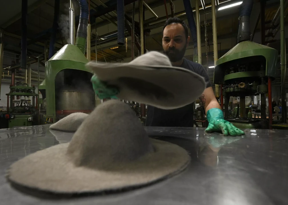 Time appears to stand still in its Piedmonte factory near Alessandria, southwest of Milan. Wooden machines dating from 1888 are used to make the felt from piles of rabbit fur, with only the softest strands selected. They are then sent in a cloud of steam onto a rotating cone, gradually taking the form of a fedora, before being sprayed with hot water and singed with flames.
