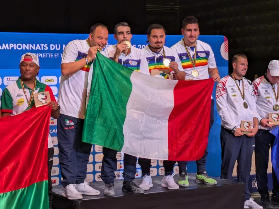 World champions at last! Andrea Chiapello, Alessio Cocciolo, Davide Laforè, Diego Rizzi, head coach Riccardo Capaccioni, and head of delegation Vincenzo Santucci are moved when the notes of the Italian anthem resound to sanction the Azzurri's triumph in the 51st World Bocce Championship in Dijon, France.