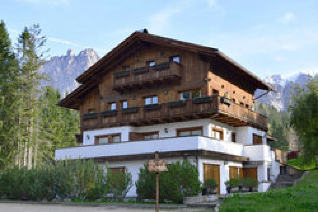This four-bedroom apartment occupies the top two floors of a four-story chalet just outside the resort town of Cortina d'Ampezzo in the Dolomite mountains. The 2,800-square-foot home was renovated in 2000, and rustic wood beams — many salvaged from a 17th-century barn — floors and paneling lend it a traditional Alpine feel.