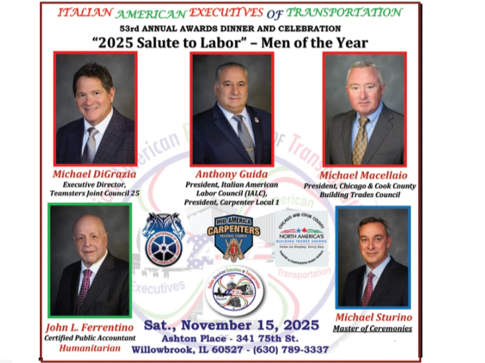 “Union Proud” will be the theme of the Italian American Executives of Transportation’s 2025 awards dinner on Nov. 15 at Ashton Place in Willowbrook. The IAET will honor labor leaders Michael DiGrazia, Anthony Guida and Michael Macellaio at the event, and present John Ferrentino with its Humanitarian of the Year Award. For details, click here. The following profiles were provided by the IAET:
