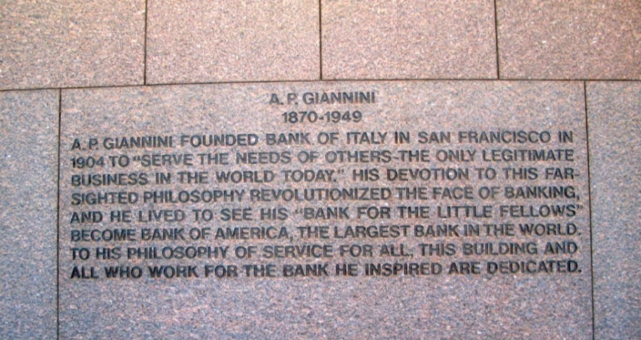 Nel 1904 Giannini fondò la Bank of Italy. Fu tra i primi banchieri a prestare soldi alla middle-class e agli immigrati, agli imprenditori del domani, cercando nei loro occhi il drive che assicurasse che avrebbero fatto di tutto per avere successo e restituire il prestito che chiedevano, senza possibilità di garantire collaterali e a volte basandosi su una semplice stretta di mano…
