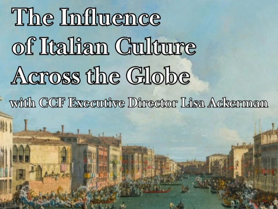 2025-01-21 @ 06:00 PM. Columbus Citizens Foundation - 8 East 69th Street, New York, NY. RSVP Here. Explore the multifaceted influence of Italian culture across the globe with CCF's Executive Director, Lisa Ackerman. Italy, a country younger than the United States, has exerted a cultural influence that remains intoxicating, mystifying, and remarkable.