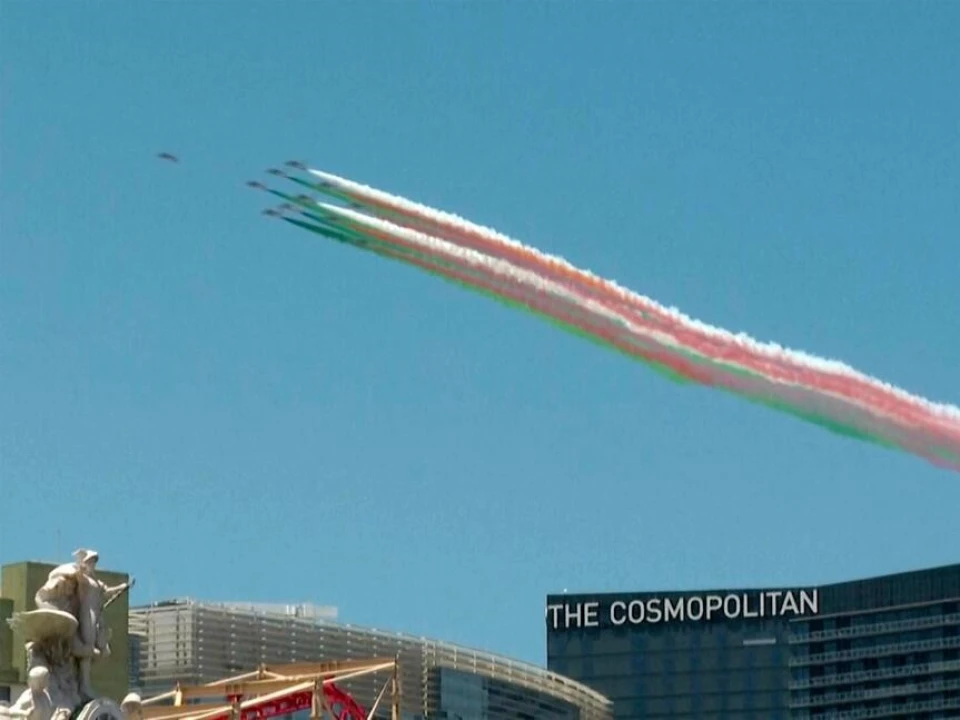 An Italian Air force precision demonstration team made a colorful green, white and red flight over the Las Vegas Strip on Wednesday as part of a North American tour headed to Los Angeles and Huntington Beach, California, for the U.S. Independence Day holiday.