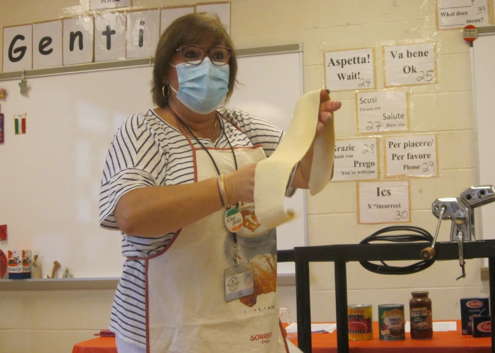 In honor of Italian-American Heritage Month in October, Ms. Schiano does her annual pasta presentation. She explains the history and origin of the names of various Italian foods. Such as La Pizza alla Margherita, Nutella, biscotti, cappuccino, pomodori and so much more. During her presentation she also demonstrates how “pasta fatta in casa” is made. She uses her mother’s 57 year old pasta machine that she brought over from Italy. It’s very special to her. Ms. Schiano shares with her students that when she was their age, they would walk to nonna’s house down the block in Jamaica, Queens. Her and her brother would turn the handle and extend their hands as “i macaroni” came out of the machine. “Che bei ricordi. What beautiful memories.” During her presentation she then gives students an opportunity to try their hands at making spaghetti. Her presentation has been so successful that some of her students have asked their parents if they can purchase a pasta machine. “This is exactly what I strive to do. To encourage them to learn about their rich heritage and beautiful culture. To inspire them to continue their studies of Italian.”