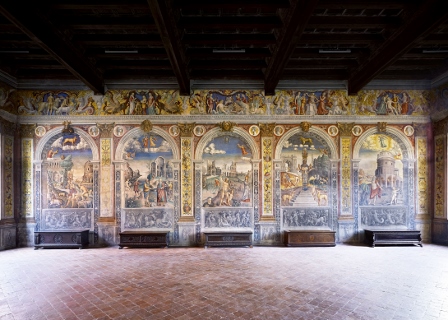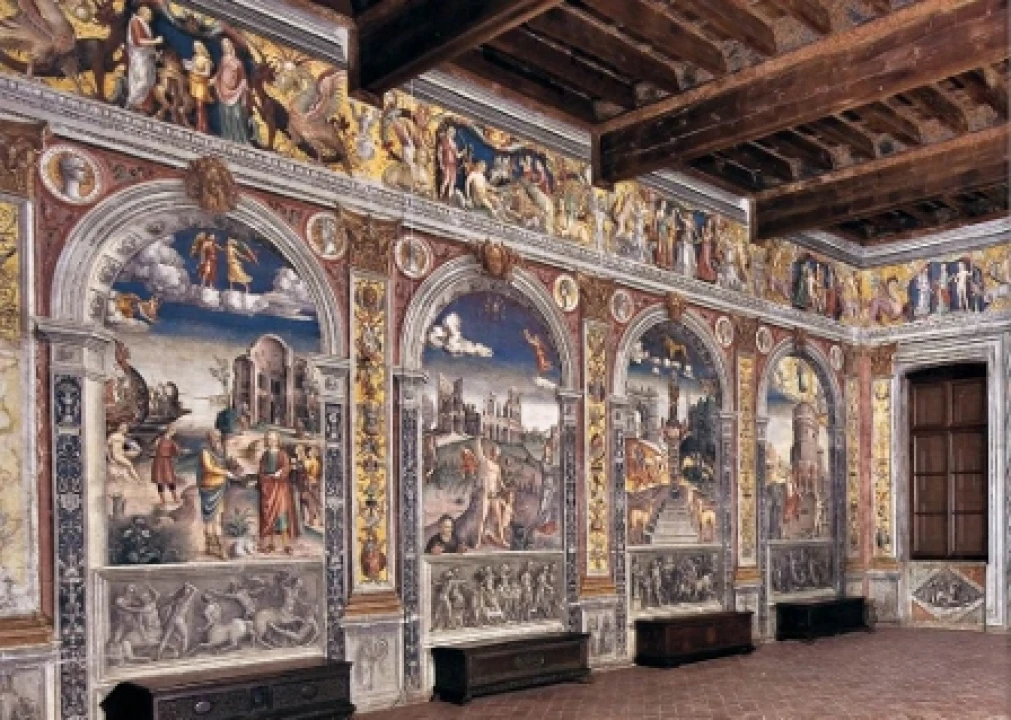 In Mantua, we have a singular case: it is Palazzo d'Arco. The cycle of frescoes in the hall of this building is clearly inspired to the zodiac, but in this case, there are no human activities or planets that govern the signs. In the large arches that mark the walls, we have episodes sometimes drawn from myths in an original way, elements of royal archeology, and scenes of a symbolic nature not always easy to interpret.
