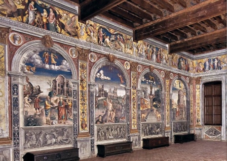 The second, much more interesting mystery, is that a room in the Palazzo Della Rovere in Rome, named "of Penitentiaries", painted by Pinturicchio and now very pale, is pretty much the source of inspiration for the whole cycle, but no one has yet discovered what kind of relationship there was between the two buildings, and especially between the two clients of the works. For sure it is not a simple copycat by Falconetto to the work of Pinturicchio, because at those time the client, not the artist, was the one to decide the theme of the artistic work. So it's unlikely that such a refined and particular iconological choice had been entirely taken and copied without a real relationship between the two places, or between the two client families.