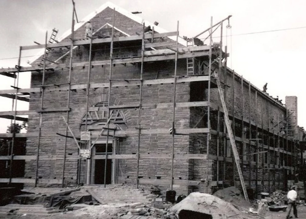 These include the Presbyterian Church of Chestnut Hill, Chestnut Hill Hospital, the Free Library, Wells Fargo Bank, and the Jacob Ruth funeral home. Shown in the above photograph is the construction of the Presbyterian Church of Chestnut Hill in 1949, with stonework executed by the Lorenzon Brothers.