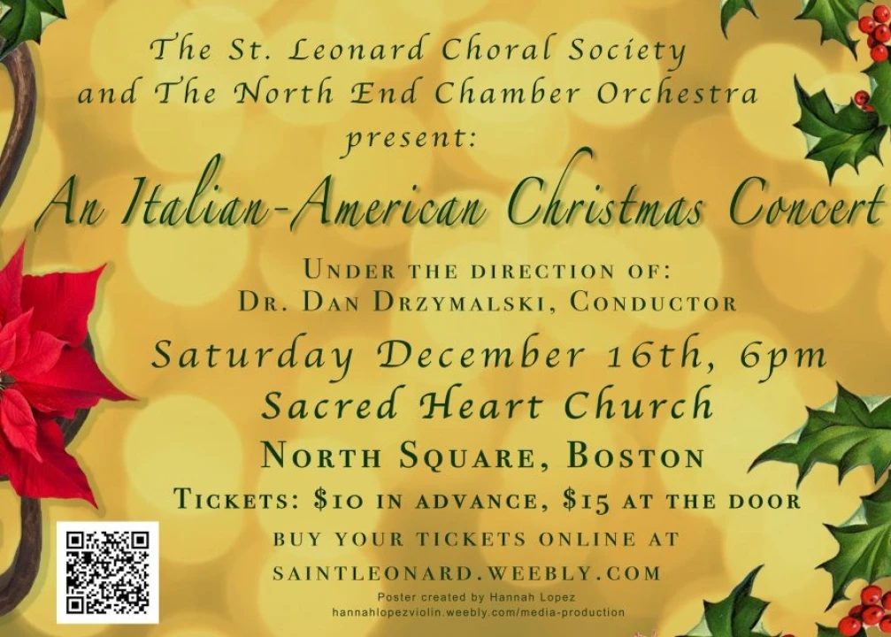 On December 16, the The Saint Leonard Choral Society accompanied by The North End Chamber Orchestra under the direction of Dr. Dan Drzymalski will perform its Annual Christmas Concert. This year’s concert is entitled “An Italian-American Christmas Concert”. Continuing with tradition, the concert will be held in the lovely setting of Historic Sacred Heart Italian Church in Boston’s North End.